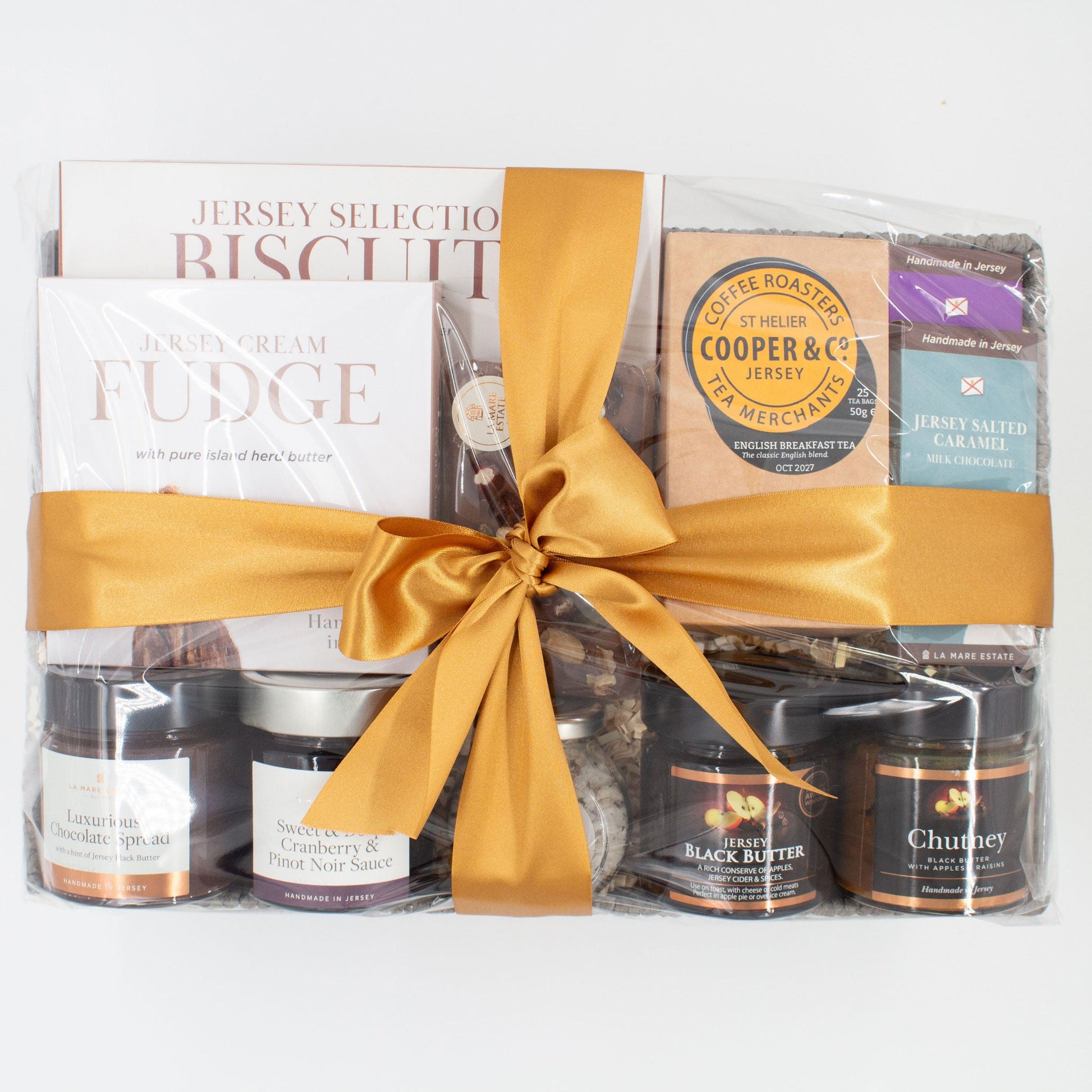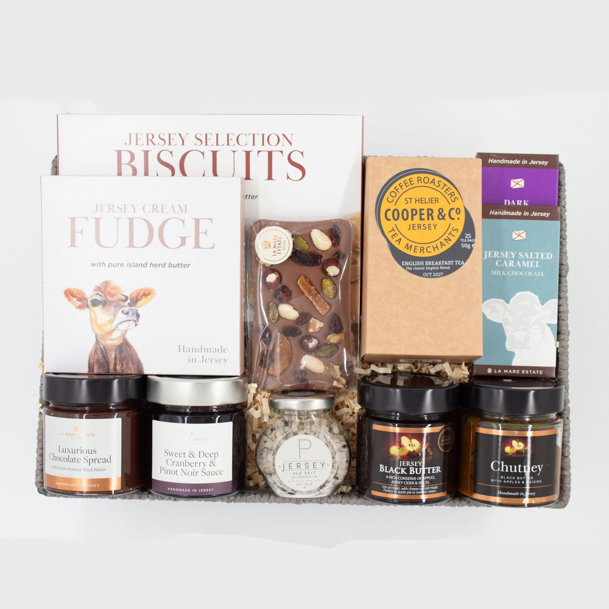 Discover the flavours of Jersey with the 'Jersey Culinary Delights Hamper'. This curated selection highlights some of the island's finest products, including the award-winning Jersey Black Butter Preserve from La Mare Wine Estate.
